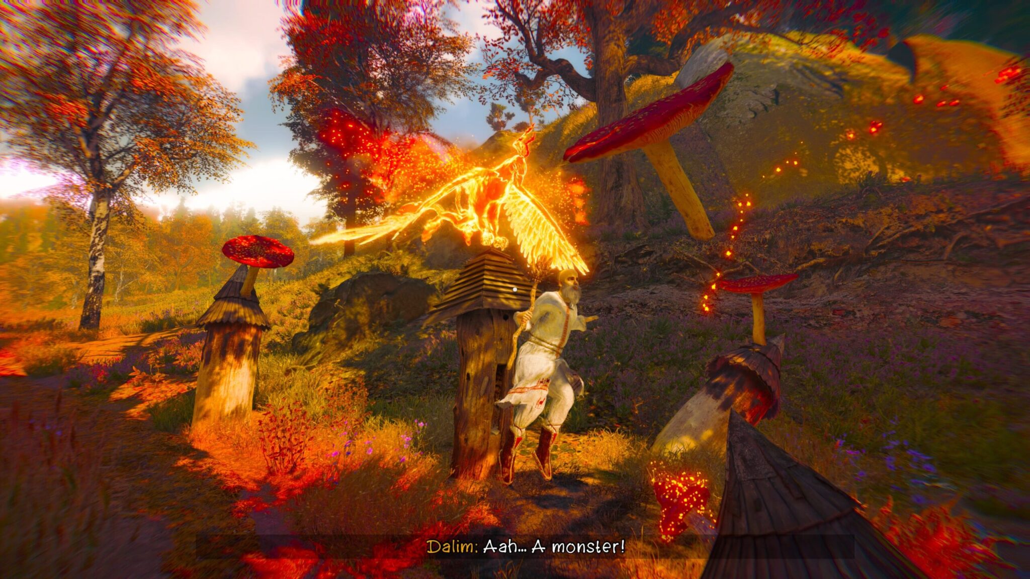 Ostatně orientace je tu klíčová, protože chození a objevování tvoří hlavní náplň hry. Doutnající ohniště slouží jako hlavní pojítko příběhu a odhalují vám, co se v minulosti ve vesnici odehrálo. Funguje to tak, že k ohništi přijdete, provedete interakci a ve vzduchu se objeví kouřové cestičky. Když je následujete, nacházíte fragmenty minulosti, například otisk chybějícího předmětu. Po spuštění fragmentu se přehraje krátká in-game animace, která vám ukáže konkrétní situaci z minulosti. Třeba že si postava ve spěchu zapomněla doma hůl a nemůže dál pokračovat. Vaším úkolem je pak tento předmět najít a doplnit ho na správné místo.