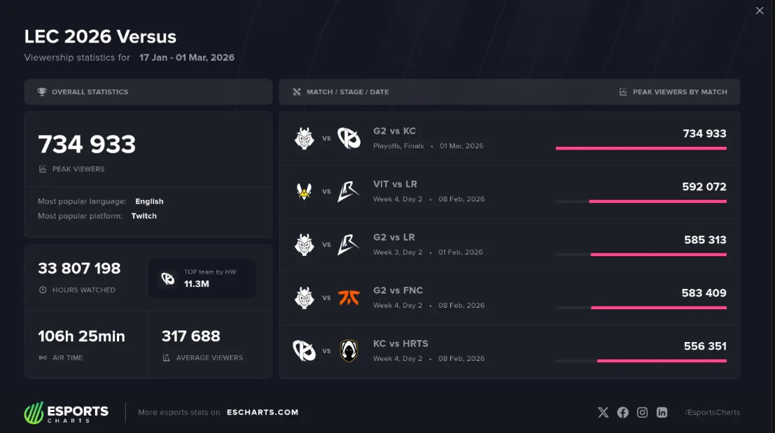 Zajímavostí je, že SK Gaming, postavený kolem Mihaela „Mikyxe“ Mehleho, skončil na pátém místě a překonal tak týmy jako Fnatic, Team Vitality nebo Natus Vincere, a to navzdory absenci v playoff. Tento split se stal také čtvrtým nejvíce sledovaným v historii LEC, pokud jde o odsledované hodiny, a to i přes kratší celkovou dobu vysílání než v předchozích letech. Pokud se podíváme na špičkovou sledovanost, LEC Versus 2026 se umístila na osmém místě, přičemž vrcholem byl zápas Karmine Corp proti G2, zatímco historický rekord přes milion diváků drží G2 vs. Fnatic z Summer 2020.