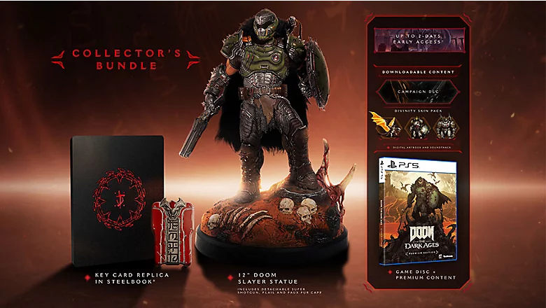 DOOM: The Dark Ages lze nyní předobejdenávat po celém světě. Kupující prémiové edice nebo sběratelského balíčku obdrží až dvoudenní dřívější přístup, obsah DLC pro režim kampaně, digitální knihu s grafikou, soundtrack a balíček skinů Divinity. Sběratelský balíček hry DOOM: The Dark Ages obsahuje toto: