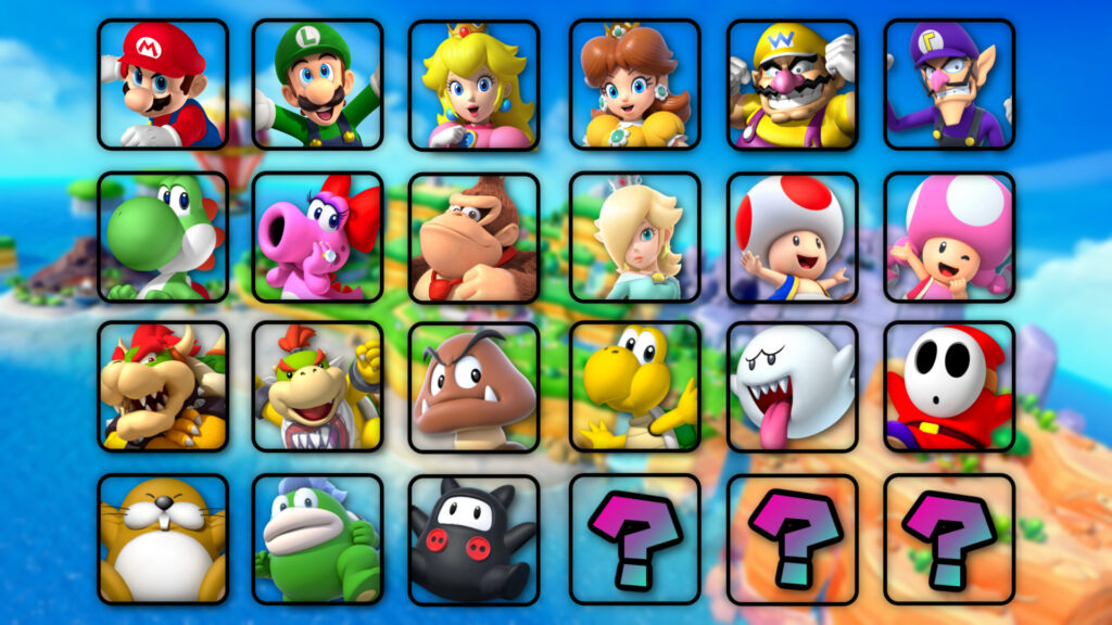 Reprezentovat nás mohou klasické postavy z Nintendo her, jako je Mario, Luigi, princezna Peach či Yoshi, ale také záporáci v čele s Bowserem, Donkey Kongem nebo Goombou. Vůbec poprvé se přitom představí v sérii Super Mario Party roztomilý, leč ďábelský protivník Ninji. V současnosti je ve hře 22 hratelných charakterů: Mario, Luigi, Princess Peach, Princess Daisy, Rosalina, Yoshi, Birdo, Toad, Toadette, Wario, Waluigi, Donkey Kong, Bowser, Bowser Jr., Goomba, Koopa Troopa, Shy Guy, Boo, Spike, Monty Mole, Ninja...