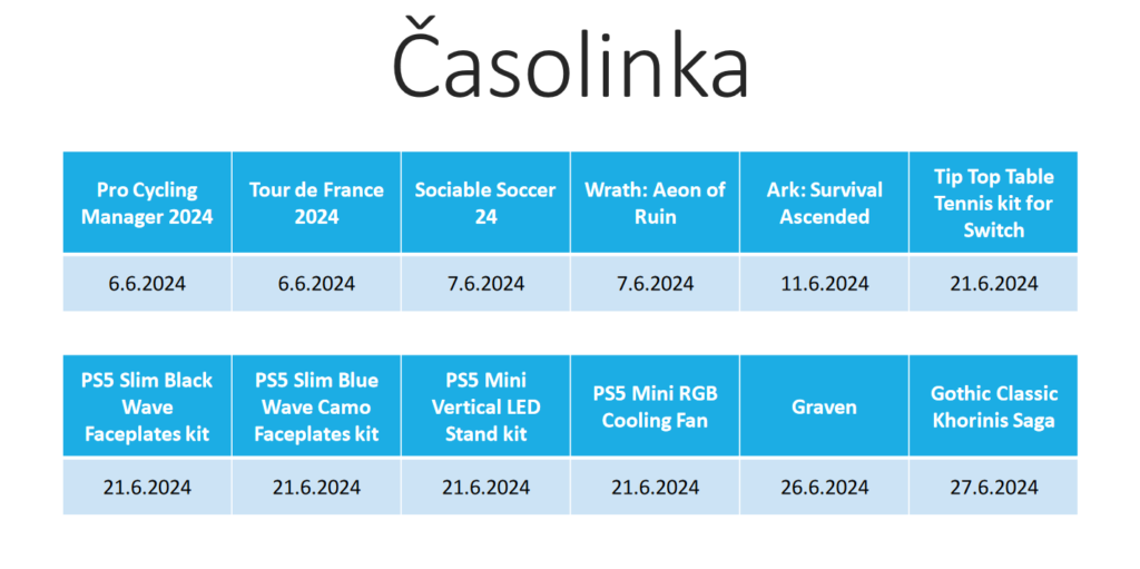 Jak sis asi v poslední době zvykl, máme kromě her i zajímavé hardwarové doplňky. Tento měsíc se jedná o pingpongový kit pro Nintendo Switch, dva Faceplates kity pro stylizování tvé PS5 Slim konzole, stojánek na konzoli a inteligentní chladící větráček, který zlepší výkon i životnost tvojí PS5 Slim. Vše vychází 21. června.