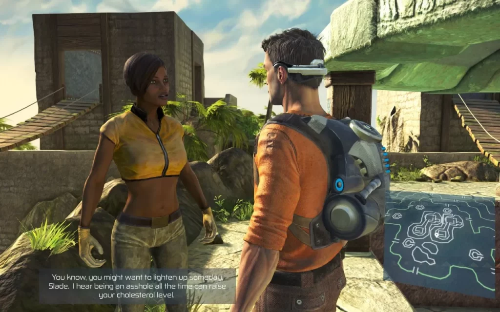Hraješ opět za postavu Cuttera Slada, který je na cizí planetě. Na začátku dostaneš misi, kde máš najít tři budovy. Trochu tápeš, protože není žádná minimapa, takže zkoumáš svůj další postup jen svým pohledem. Není to naštěstí ale nijak složité. Mapu pochopitelně časem získáš. Stejně jako první zbraň, štít a jetpack. Kdo hrál například No Man's Sky, tak jistě ví, o co jde. Zatím tedy dobrý, vyberu pár beden, porazím pár nepřátel, poskáču si, proletím se. Dojdu do první vesnice a od té doby prvotní nadšení trochu opadá. Spousta rozhovorů, kterým nerozumím (byť je to záměr a různé slovíčka jsou vysvětlena po zmáčknutí jedné klávesy), ale hlavně přijmutí nějaké mise mi moc nesedělo. Snad pět, šest kliknutí je třeba na to, abych nějakou našel a nastavil její sledování.
