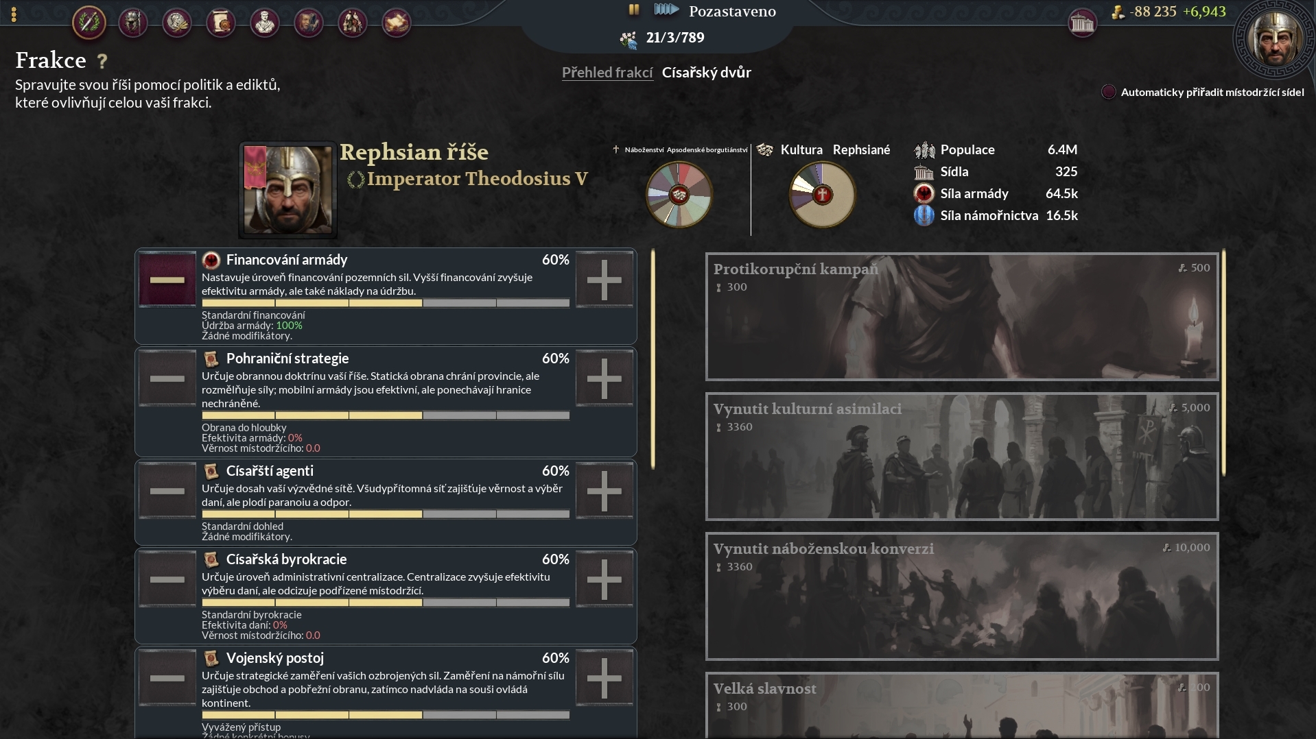 Postupně se však jednotlivé prvky propojí do čitelné sítě vztahů. Stabilita, ekonomika, diplomacie a vojenská síla přestanou být oddělenými čísly a začnou fungovat jako propojený celek. Ve chvíli, kdy tento celek pochopíte, hra se otevře. A tlak začne být nejen frustrující, ale i fascinující.