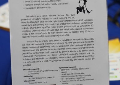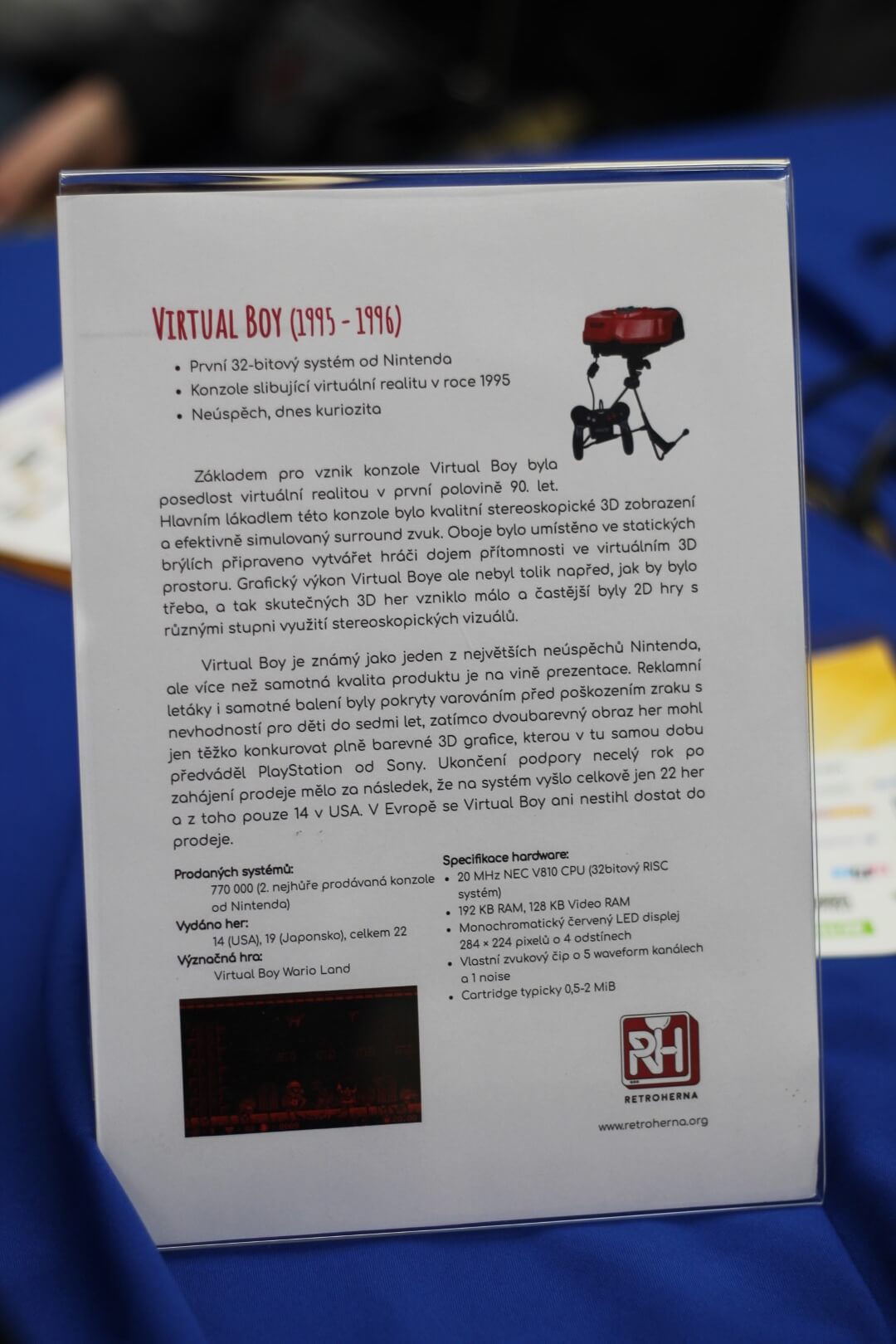 Na akci Comic-Con Prague 2020 jsem měl možnost vyzkoušet neúspěšnou herní kuriozitu Virtual Boy od Nintenda se hrou Mario Clash (1995). Jako jedna z prvních konzolí měla přinést masově hráčům stereoskopické 3D zobrazení a dojem 3D prostoru. Skutečných 3D her na ni ale vyšlo málo a častější byly 2D hry s různými stupni využití stereoskopických vizuálů. Celkem vzniklo pro tento systém jen 22 her a z toho pouze 14 se dalo koupit v USA. V Evropě se Virtual Boy ani nestihl dostat do prodeje, protože jeho podpora byla ukončena necelý rok po zahájení prodeje.
