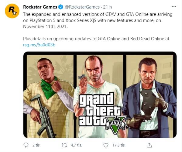 Studio Rockstar Games na svém Twitteru uvedlo, že hra GTA V včetně GTA Online vyjde rozšířená a vylepšená pro konzole PlayStation 5 a Xbox Series letos 11. listopadu.