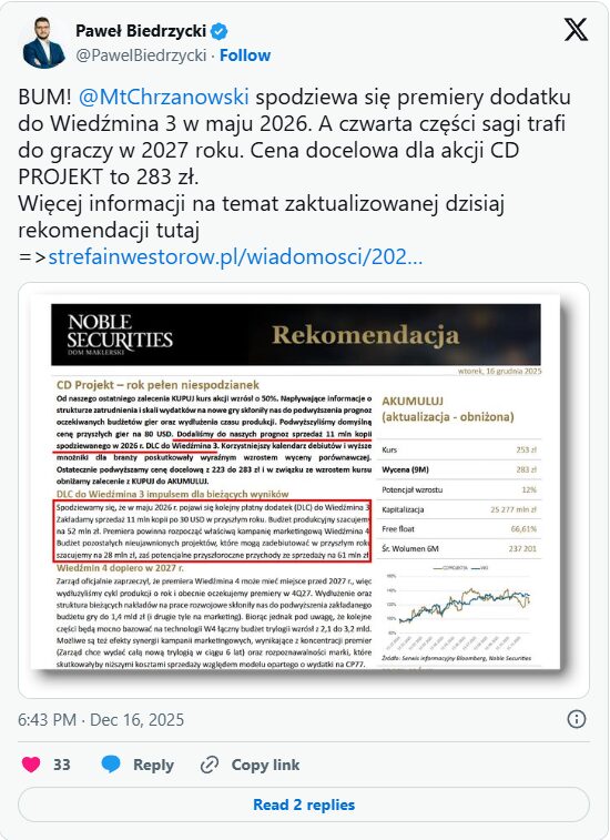 Zdá se, že CD Projekt RED by mohl fanoušky Zaklínače 3: Divoký hon ještě jednou překvapit. Podle analytika Mateusze Chrzanowského z investiční společnosti Noble Securities má studio údajně v tichosti připravovat třetí placené rozšíření, které by vyšlo jako speciální překvapení k výročí vydání hry.