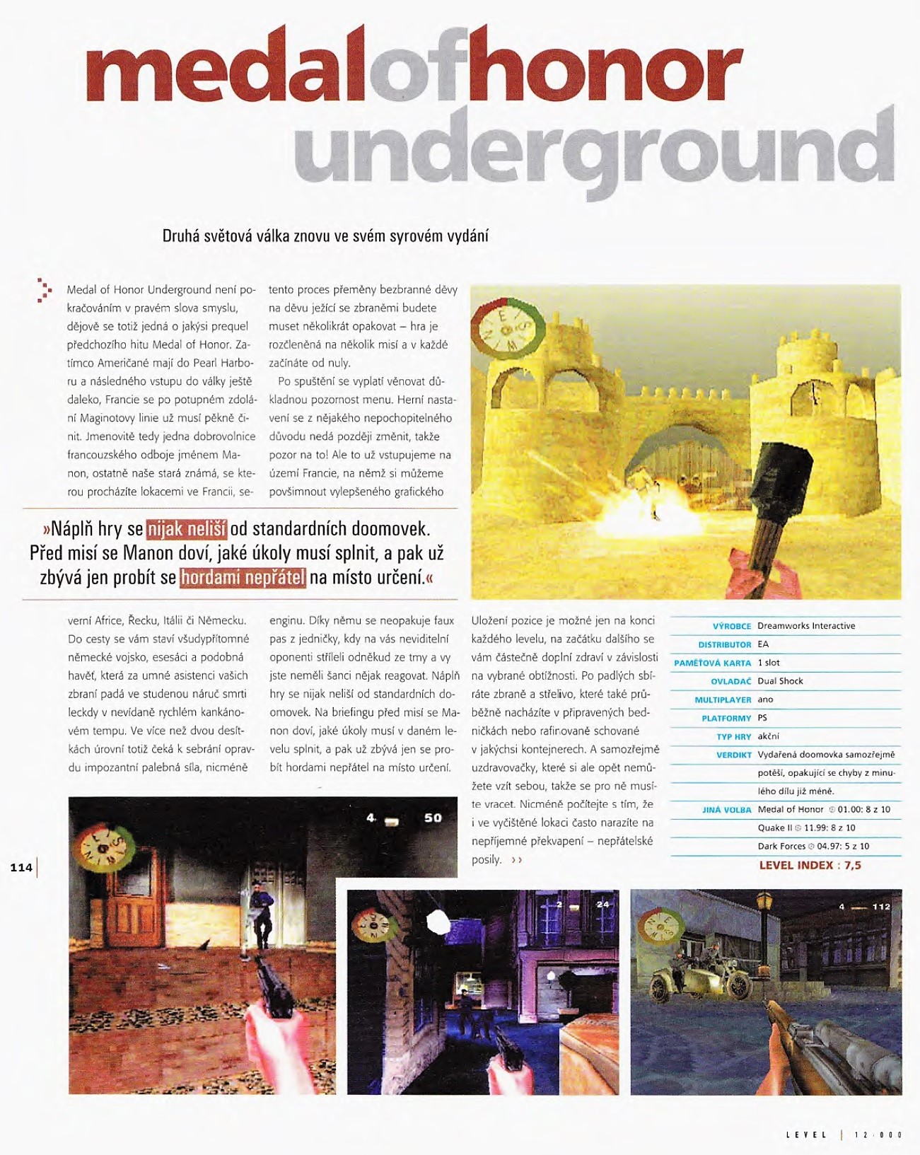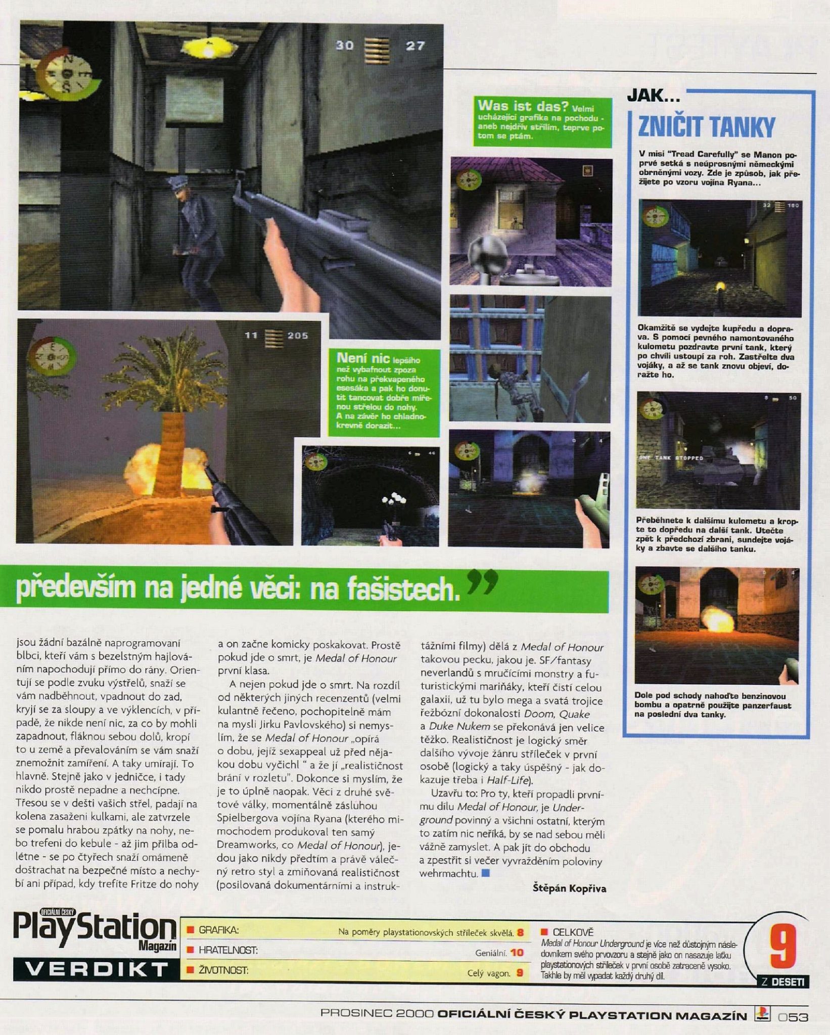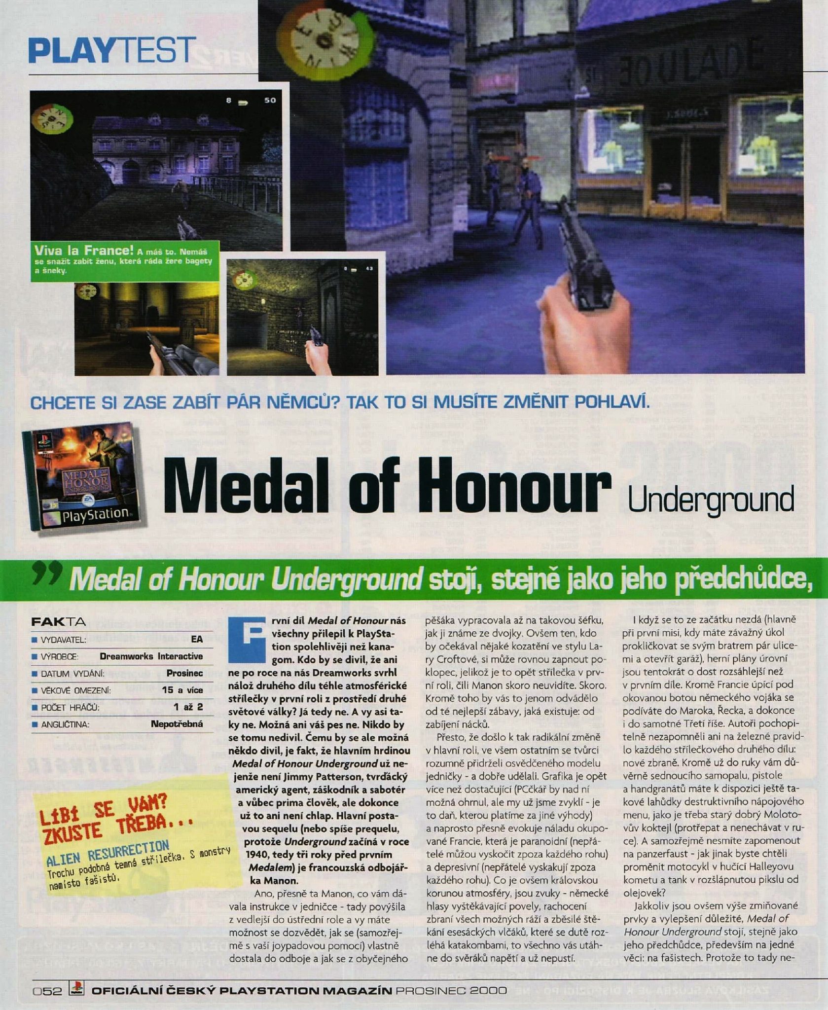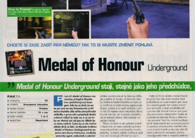 Medal of Honor: Underground (v překladu Medaile cti: Podzemí) je pokračování hry Medal of Honor z roku 1999. Hra byla vydána v roce 2000 pro PlayStation, ale později v roce 2003 vyšla také pro Game Boy Advance. My jsme si zahráli tu první PlayStationovou a byla to bomba. Jen poslední hodina repetitivního opakování při hledání a plnění posledního úkolu byl pro mě horor! 😀