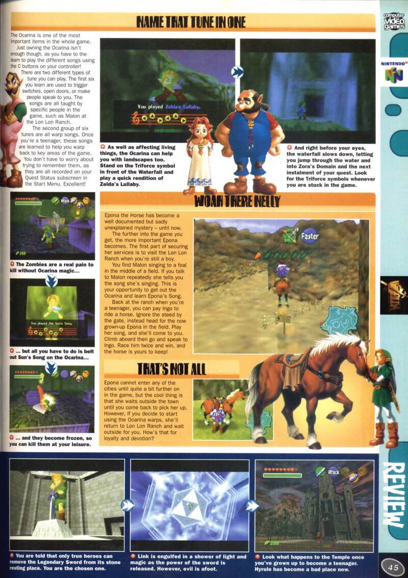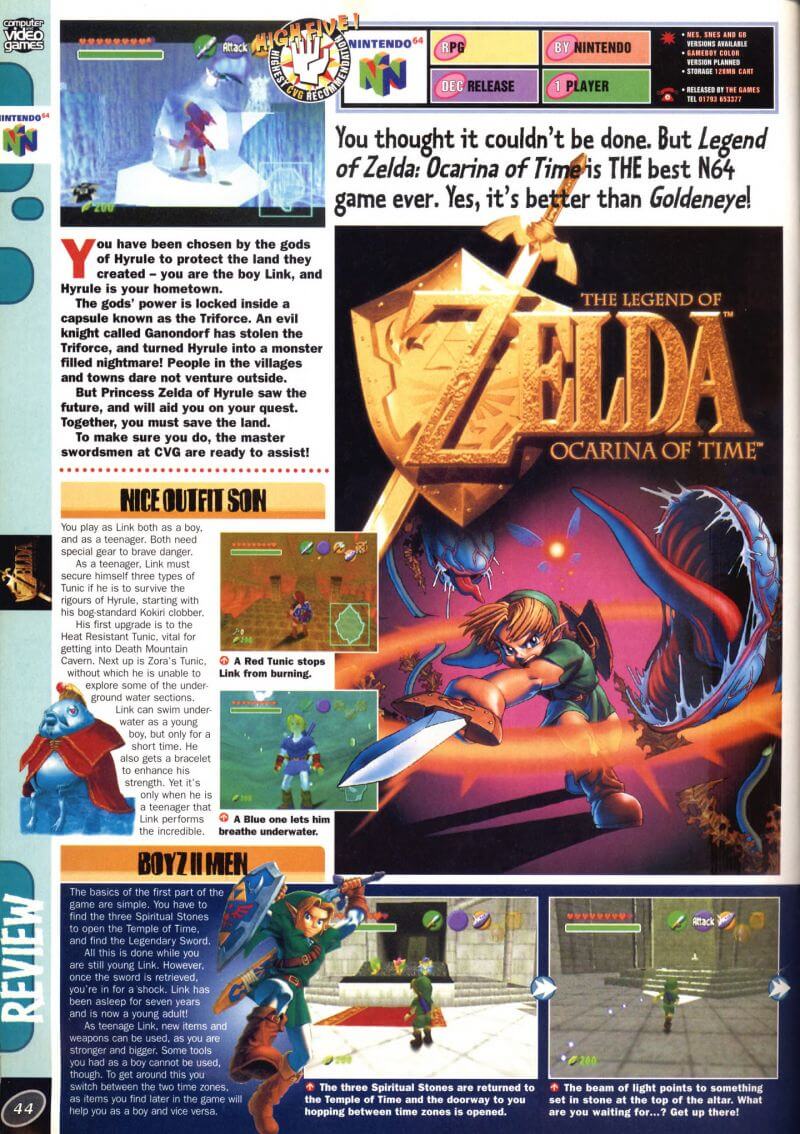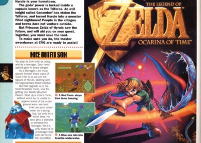 The Legend of Zelda: Ocarina of Time je akční adventura vyvinutá a publikovaná Nintendem pro Nintendo 64 . Hry vyšla v Japonsku a Severní Americe v listopadu 1998, a v Evropě a Austrálii o měsíc pouději. Ocarina of Time je pátá hra v sérii The Legend of Zelda, a první s 3D grafikou. Na GameRankings.com má průměrné hodnocení z recenzí 97.54% a je tam tak jako druhá nejlepší hra všech dob.