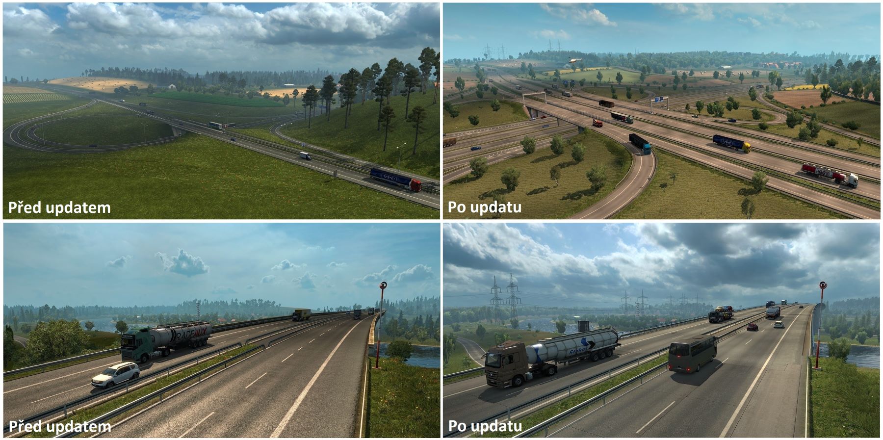 O posledním významném updatu se ale zmínit musím. Hra totiž získala zbrusu novou možnost vlastnění přívěsu. Už tedy nemusíš jezdit pro přívěs k zadavateli zakázek, nově ti stačí jen naložit samotný náklad. Tato možnost platí i pro řidiče, které zaměstnáváš. Na této implementaci studio pracovalo více než rok a nebylo to úplně snadné, jelikož takový příklon k realitě ovlivňuje i další složky hry jako je ekonomika, logika, kamery, UI či modely samotných trucků a přívěsů včetně kol nebo nádrží na vodu. Nově byl vylepšen i fyzikální engine (brzdění, tlumení, odpružení, těžiště) a vizuální podoba dešťových kapek na skle tahače, kdy teď kapky vypadají přirozeněji a lépe také reagují na pohyby tvého tahače. Velké vylepšení doznala i oblast Německa, na kterou je vyčleněný speciální tým, jehož hlavním úkolem je tuto oblast od severu na jih postupně neustále předělávat. Její změny zahrnují nové textury, vegetaci, předělané zástavby a silnice. Ostatně sám se podívej na obrázek níže a uznáš, že ty změny jsou opravdu zásadní.