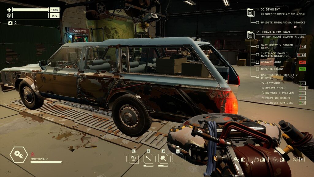 Přiznám se, že tohle mi vcelku vadilo, asi nemám tu trpělivost. Před startem na tuto misi jsem strávil na základně bezmála 30 minut opravami atp, abych po pár minutách cesty mohl vše dělat znovu… Auto můžeš totiž opravovat i během mise, ale ne všechny části, nicméně základy ano. V kufru si totiž vozíš s sebou „ponk“, který tí některé díly i nářadí vyrobí. Nicméně, tohle zabere další spousty minut a to se člověk třeba ani nikam nedostal ještě. A pokud nemáš s sebou dost materiálů, půjdeš je hledat pěšky.
