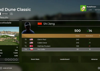 Než začne pouť prodírání se žebříčkem až na vrchol, je třeba si vybrat postavu. Na výběr je několik základních postav, které lze následně upravovat. Množství úprav je velmi široké – od pozice úst, přes šířku, výšku, odstín až po odstávání uší. S výběrem účesu je to trošku horší, ale popravdě, správný golfista má stejně nějaký klobouček či kšilt na hlavě. Oblečení je ze začátku dost limitované. Většina se odmyká až postupem hry sbíráním XP, darem od sponzorů či koupí za místní měnu. Co se týče setu golfových holí, i ty se dají měnit, ale stejně jako oblečení jsou ze začátku z větší části zamčené. Škoda, že nejsem golfový expert, abych ocenila různé statistiky desítek nabízených holí a dokázala si vytvořit vlastní ideální set. V základu jsem si vystačila s předem definovaným bagem a neměla ambice zkoušet něco nového.