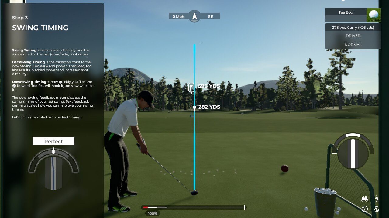 Následuje základní tutoriál. Nápřah pomocí joysticku směrem k sobě a úder směrem od sebe. Jde o jednoduchý pohyb, ale zvládnutí přesné citlivé mechaniky dá zabrat, jelikož přesnost/rovnost letu je určována správným pohybem joysticku vpřed. Čím rovněji a rychleji, tím lépe. K tomu se při nápřahu musíš trefit do ideální síly. Pak přijde foukání větru, sklon dráhy, možnosti zakřivení odpalu a mnoho dalšího. Musím uznat, že simulace jako taková je velmi komplexní a dobře promyšlená. K tomu znějí hlasy komentátorů v angličtině, které popisují danou situaci. To vše přispívá k pocitu, že člověk hraje golf. Ovšem pak přijdou momenty, které hru bohužel kazí.