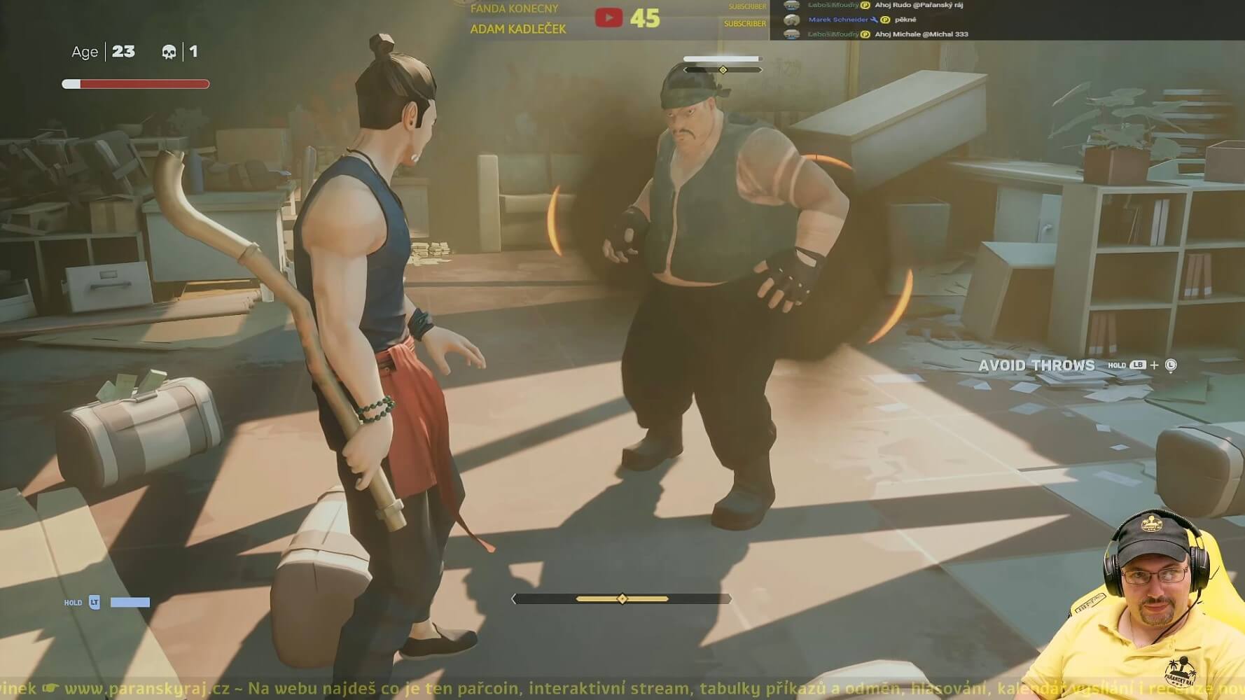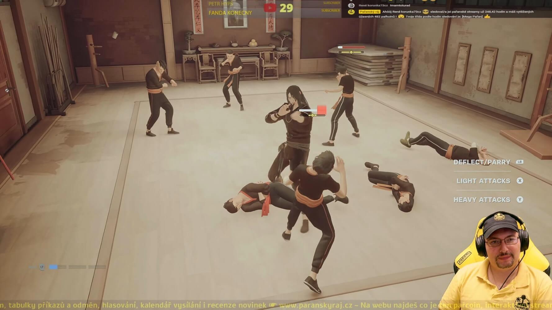 Obtížnost soubojů bych přirovnal k takovému odlehčenějšímu Dark Soul. Hlavními ukazateli kromě zdraví je míra staminy. Ten se ti, ale i nepřátelům, naplňuje podle toho, kolik úderů vykryjete v řadě a zároveň ukazuje, kolik jich ještě vydržíte. Jakmile dostaneš poslední úder a ukazatel přeteče, přestaneš být schopen krytí. Na krátký moment tak zůstaneš kompletně bez obrany a nepřátelé tě pak mohou rozštípat jako bambus. Nutno říci, že úderů nevydržíš mnoho, tudíž dostat na kokos je tu opravdu snadné. Nejlepší strategií tak zde kupodivu není naběhnout do místnosti a začít masírovat lymfatické uzliny všem okolo, ale naopak vyčkávat na správný okamžik, až útočník zaútočí první– odrazit jeho úder, přesunout se, chopit se tyče a rozdat pro změnu pár ran jako první.